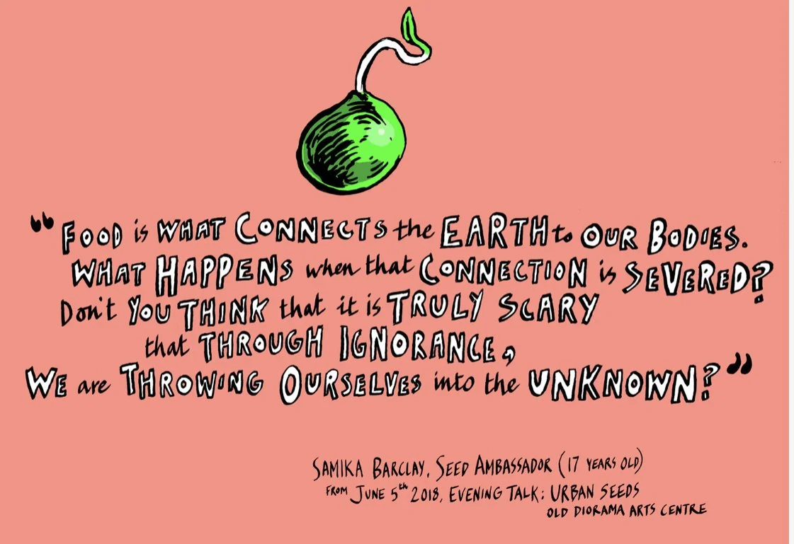 “I question now the metaphor in which seeds represent beginnings. Seeds of change, seeds of hope, and so on. Of course in a world of linear thinking that would e the meaning ascribed to seeds. But hold on. Seeds lead us just as much into what came before as into what comes next....The seeds are a past and a future... they are travellers...they are immigrants, hitch-hiking with the cultural fusions that animals and peoples make. Taking their bread with them. Taking grandma’s recipes. Seeds get caught in your fur if you are wolf and take a whole winter to run through the digestion of a bear”